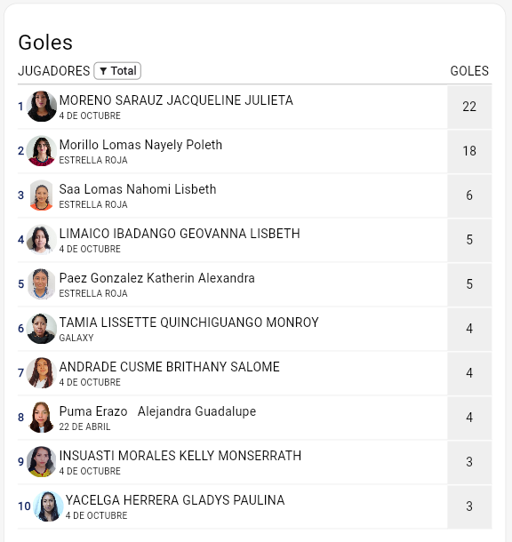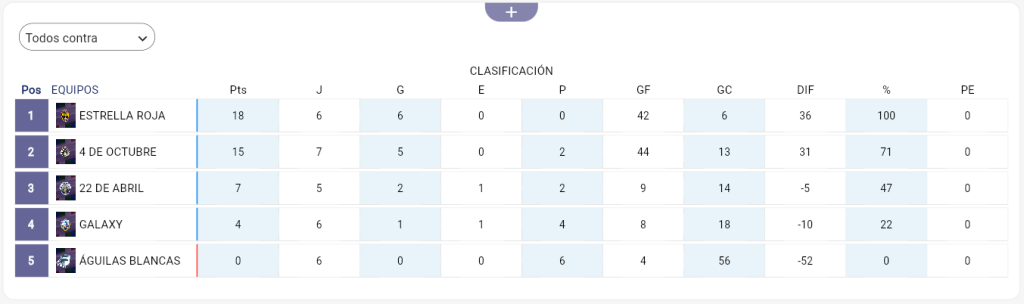 En la rama femenina —con 22 de Abril, 4 de Octubre, Águilas Blancas, Estrella Roja y Galaxy— el formato todos contra todos ha dejado una tabla clara: Estrella Roja está intratable, puntaje perfecto y diferencia de goles de otro planeta. Le sigue 4 de Octubre, que además tiene a la goleadora Jacqueline Moreno con 22 tantos.