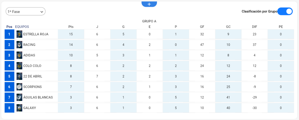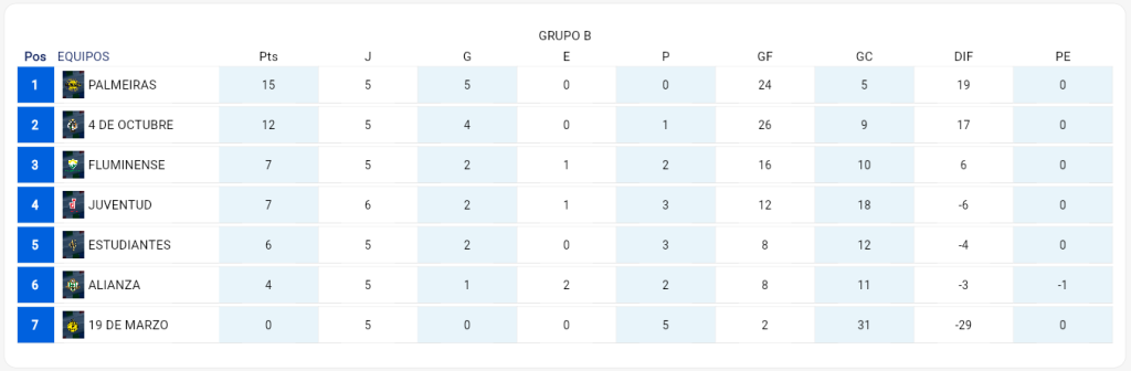 Tras 7 fechas, la tabla ya no miente. En el Grupo A, Estrella Roja manda con autoridad: puntaje alto, diferencia brutal y paso firme. Pero atrás viene respirando en la nuca Racing de Perugal, que además tiene al goleador del torneo, Owen Acurio, con 23 tantos. Una locura. En el Grupo B, Palmeiras está intratable, mientras 4 de Octubre se sostiene como escolta firme.